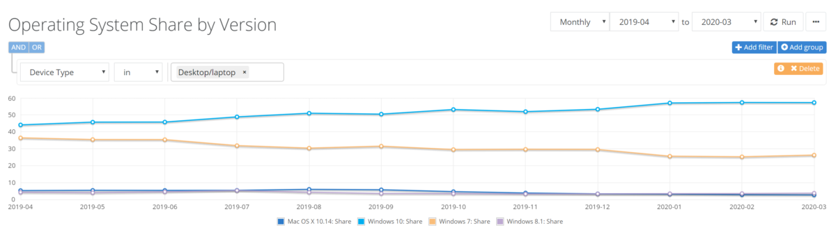 本月的操作系统市场份额数字变化不大, Windows 10本月未获得任何重大的市场份额提升,相反Windows 7的市场份额有小幅反弹,这可能是由于人们在家中工作时使用旧PC所致。