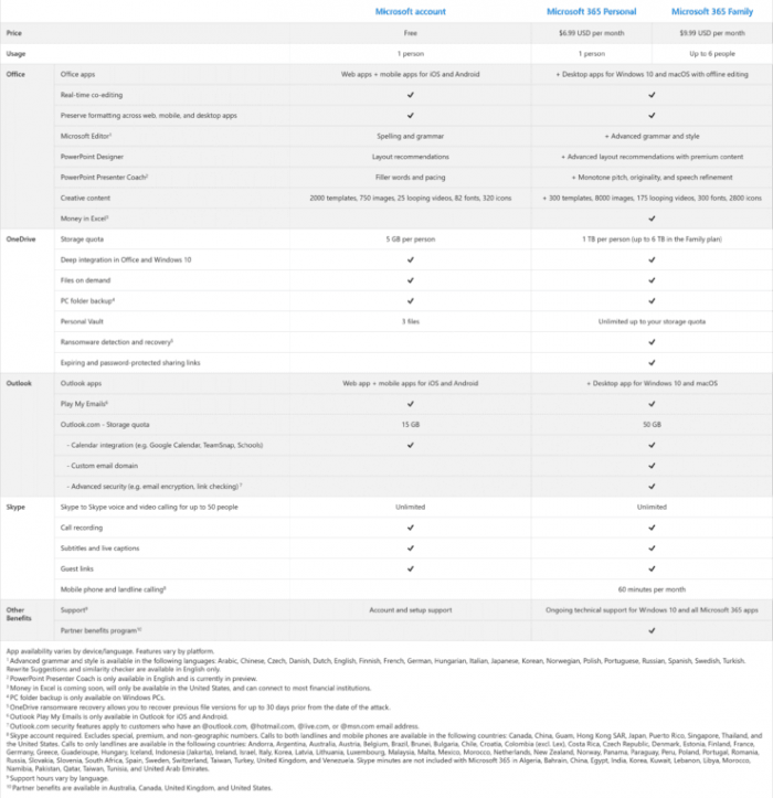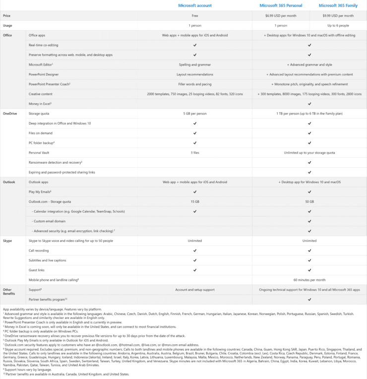 Microsoft 365 将涵盖 Office 365 中已经包含的所有内容,例如:桌面 Office 应用程序、每人 1TB 的 OneDrive 云存储、60 分钟 Skype 通话、安全功能、技术支持以及新 Office 功能,这些功能将配合 Word、Excel、PowerPoint、Outlook 和 Microsoft Teams 进行使用。