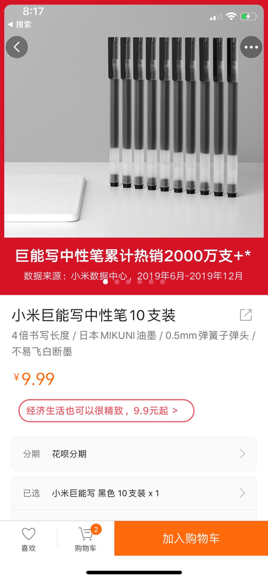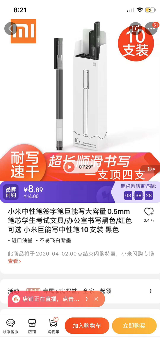 老罗直播售卖的第一个产品是小米巨能写中性笔,售价为9.99元一盒十支包邮。不过,有网友表示,这个产品在其他平台也是同样的价格。几分钟后该商品已显示无货,售出75420件。第二件货品为奈雪88元100元心意卡。