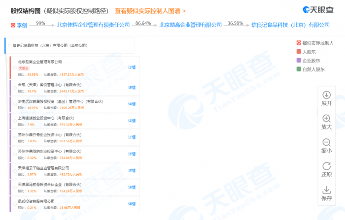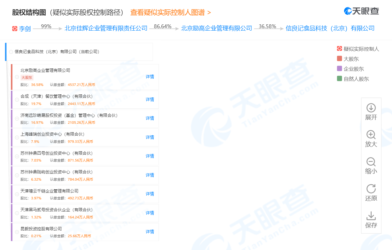 天眼查股东信息显示,信良记的最大股东,为北京励高企业管理有限公司,持股比例36.58%,峰瑞资本、钟鼎资本、黑马基金也在股东之列。2019年7月,信良记完成3亿元人民币的再融资,由国内另类资产管理机构——远洋资本有限公司独家领投,钟鼎资本、峰瑞资本跟投。