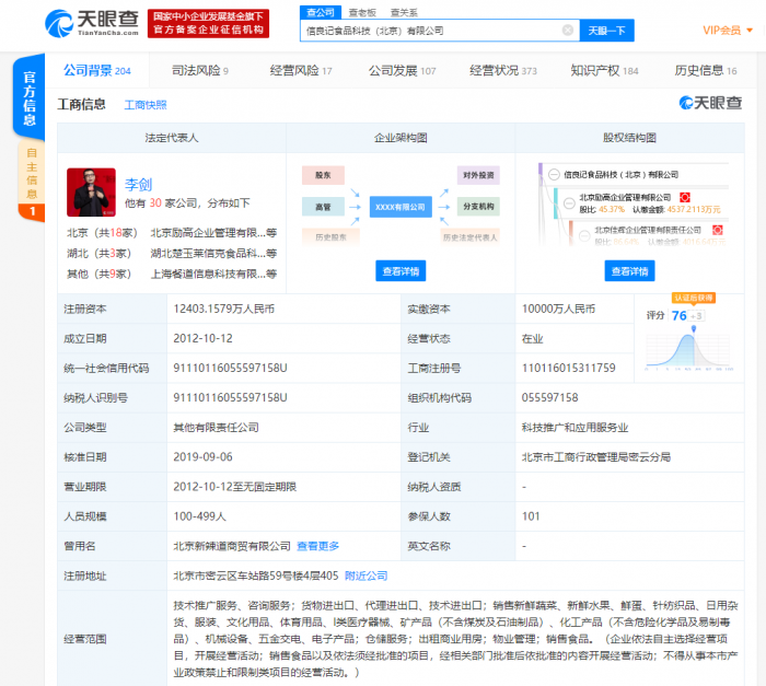 天眼查数据显示,信良记的运营主体为信良记食品科技(北京)有限公司,公司成立于2012年10月,注册资本约1.24亿人民币,公司经营范围包括销售新鲜蔬菜、新鲜水果、鲜蛋、针纺织品、日用杂货、服装、文化用品、体育用品、I类医疗器械、矿产品(不含煤炭及石油制品),销售食品等,法定代表人为信良记CEO李剑,值得一提的是,李剑也是著名的新辣道鱼火锅的创始人。