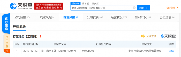 不过,天眼查风险数据显示,2019年10月,因广告主发布使用虚构、伪造或者无法验证的科研成果、统计资料、调查结果、文摘、引用语等信息作证明材料的虚假广告,信良记被北京市密云区市场监督管理局罚款900元。