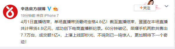 昨日晚间,截至直播结束,辛巴团队直播带货最终交易额为4.8亿元,成功创下电商直播新纪录。期间,60分钟破亿元,荣耀手机两款共售出7.7万台,成交额1亿+。