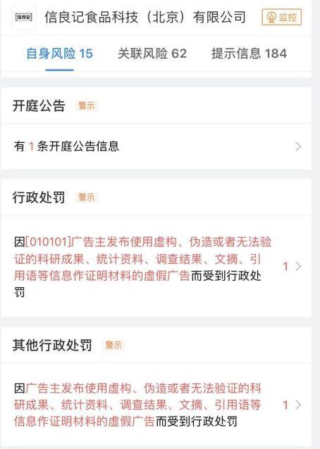 天眼查风险数据显示,2019年10月,因广告主发布使用虚构、伪造或者无法验证的科研成果、统计资料、调查结果、文摘、引用语等信息作证明材料的虚假广告,信良记被北京市密云区市场监督管理局罚款900元。