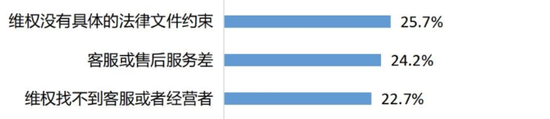 根据统计,25.7%的用户表示维权没有法律文件约束(发票),24.2%的用户表示客服或者售后服务差,甚至还有22.7%用户表示维权根本找不到客服与经营者。