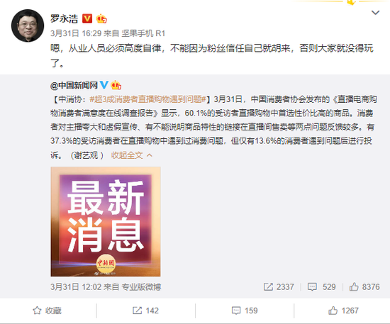 中消协这份报告刚刚发出没多久,老罗就在个人微博转发了相关的新闻,表示直播购物的从业人员需要高度自律,不要辜负粉丝们的信任。说明老罗对这样的现象深恶痛绝,毕竟败坏了整个行业,作为从业者的老罗也自然受到影响。