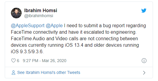 此外,这个问题似乎也影响了最新版本的macOS-macOS 10.15.4,现在无法与运行带有语音和视频的运行iOS 9.3.6或iOS 9.3.5的旧设备的设备连接。