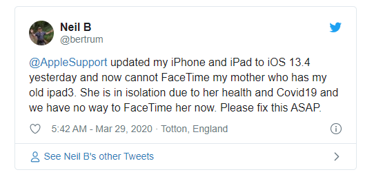 运行iOS 13.3.1或macOS 10.15.3的设备仍可以使用较旧的设备进行FaceTime通话,因此尚不清楚这是否是仅在iOS 13.4中出现的bug。苹果公司没有立即回应置评请求。