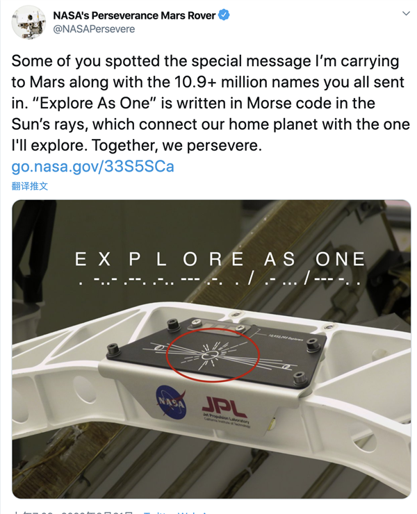 很快,万能的网友就破解了NASA的神秘编码,这是一串摩尔斯电码编写的口号——“Explore As One”(让我们一同探索这无垠深空)。