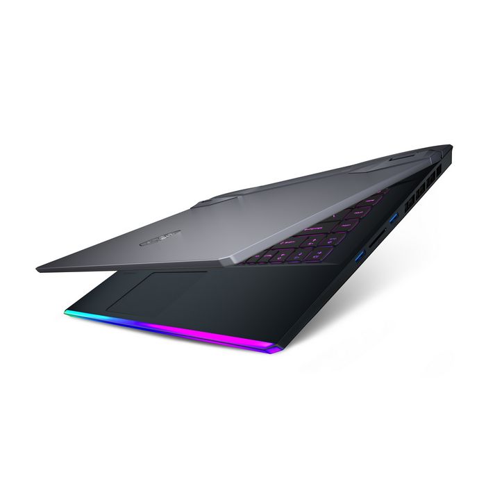 GE66 Raider 采用了 15.6 英寸显示屏 + 具有科幻外观的铝制机身,机身前部集成了一条幻彩 RGB 灯带。