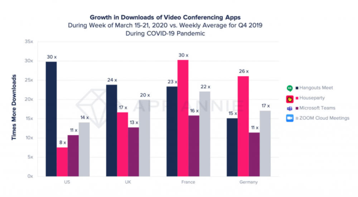 在创纪录的一周下载量中,Zoom 的下载量是 2019 年第四季度美国每周平均下载量的 14 倍。英国的下载量也是第四季度每周平均下载量的 20多倍,法国是 22 倍,德国是 17 倍,西班牙是 27 倍,意大利更是达到 55 倍,当之无愧成为国外办公的软件。