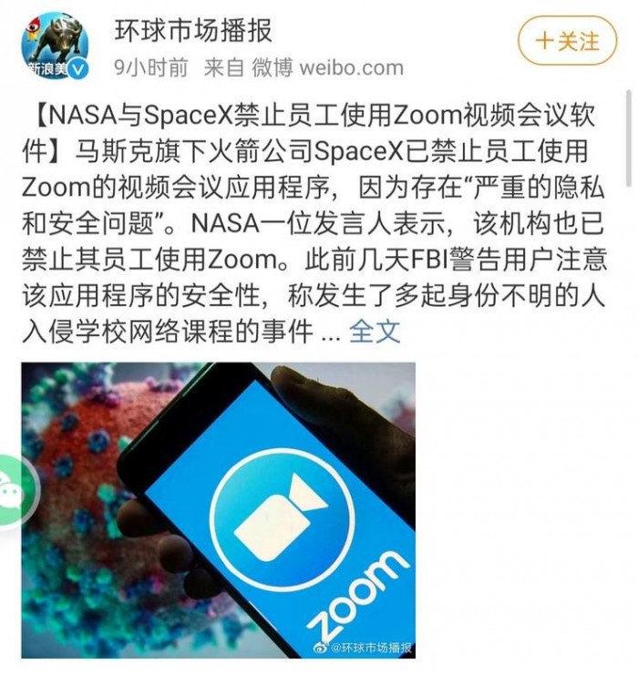 3 月 28 日 SpaceX 在发给员工的一封电子邮件中要求员工立即停止使用 Zoom 。信中谈到:“我们知道,我们中的很多人正在使用这一工具进行会议。但请使用电子邮件、短信或者电话作为代替通信的手段。”