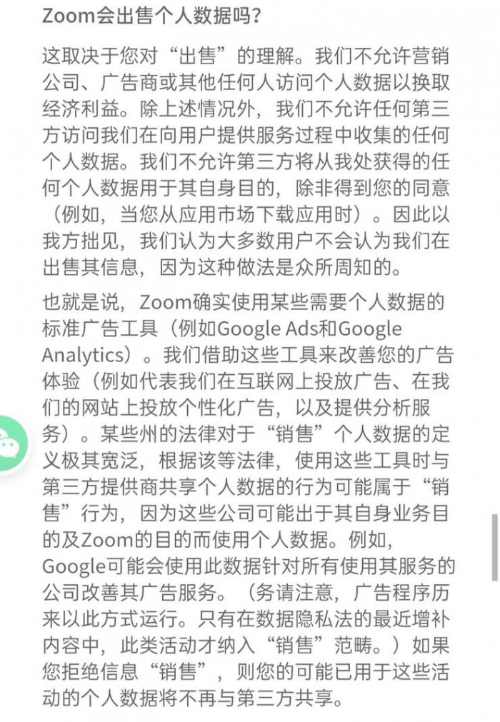 值得注意的是,在其隐私权政策中,在“Zoom 会出售个人数据吗?”条目下,Zoom 的说法是:“取决于您所说的‘卖出'。”Zoom 的政策虽然声称不会将个人数据出售给第三方,但却会与这些公司的“第三方”共享个人数据目的。