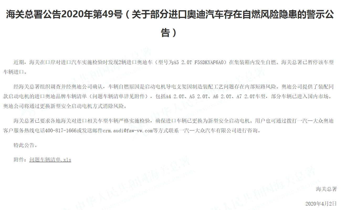 4月2日消息,据海关总署发布消息显示,近期,海关在口岸对进口汽车实施检验时发现2辆进口奥迪车(型号为A5 2.0T F5SDKYAF6A0),在集装箱内发生自燃。当前已暂停该车型的车辆进口工作。