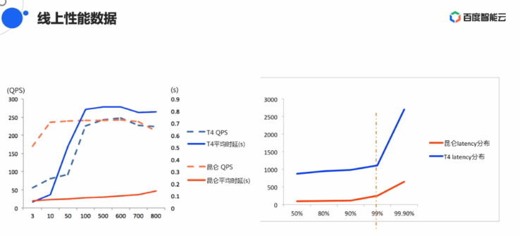 在线上性能数据的表现上,昆仑的表现相比英伟达T4更加稳定,且延迟也有优势。