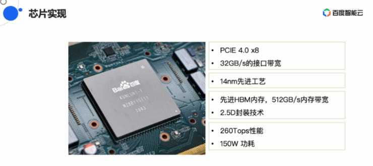 昆仑第一代芯片并没有采用NVLink,而是通过PCIE 4.0接口进行互联。在三星14nm的制造工艺和2.5D封装的支持下,昆仑芯片峰值性能可以达到260TOPS,功耗为150W。