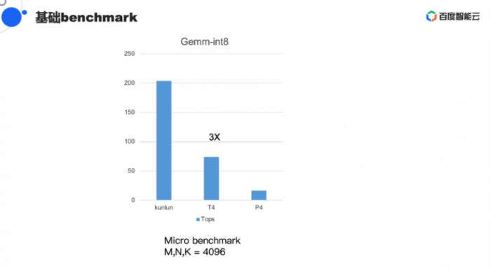 在今天的分享中,欧阳剑给出了一系列K200对比英伟达T4的数据,其中在Gemm-Int8数据类型,4K X 4K的矩阵下,昆仑K200的Benchmark分出超过2000,是英伟达T4的3倍多。