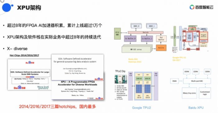 2018年的百度AI开发者大会上,百度创始人、董事长兼CEO李彦宏宣布推出自研AI芯片昆仑。百度研发AI芯片的积累得益于其用FPGA做AI加速的积累,也得益于其在软件定义加速器和XPU架构的多年积累。