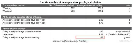 在我们追踪的981个门店日中,我们的员工通常都是坐在门店里,可以直接观察到收款柜台的动向,在记录视频的同时,计算取走瑞幸产品的顾客数量。如果交付订单的是外卖配送人员,我们计算瑞幸纸袋的数量,知道每个人员都可以一次接多个订单(一个订单可以包含多个包,所以我们可能在数量上超过订单的数量)。顾客数量+配送人员取走纸袋的数量的总和可以很好的代表每天每个门店的订单总量。将订单数量乘以每个订单1.14的商品数量,就得到了要验证的关键指标——每个门店每天的商品销量。