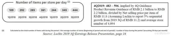 4Q2019: 483 - 506,根据4Q指引,产品收入指引为21亿至22亿元,除以每件产品11.8元的净售价(假设瑞幸从2019年第三季度开始实现5%的环比增长,即11.2元)和平均门店数量4094家。