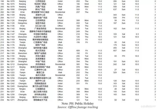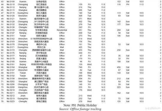 我们动员了92名全职和1418名兼职人员在现场进行监控,成功记录了981个门店日的客流量,覆盖了620家门店100%的营业时间。门店选择方法基于城市和地点类型的分布,与瑞幸的4507家直营店预计2019年底开业的情况相同。瑞幸的4507家门店分布在53个城市,我们覆盖了38个城市,其中96%的门店都位于这些城市。通过分析瑞幸店铺的详细地址来确定店铺的位置类型:我们将门店分为办公室、商场、学校、住宅、交通、酒店等。
