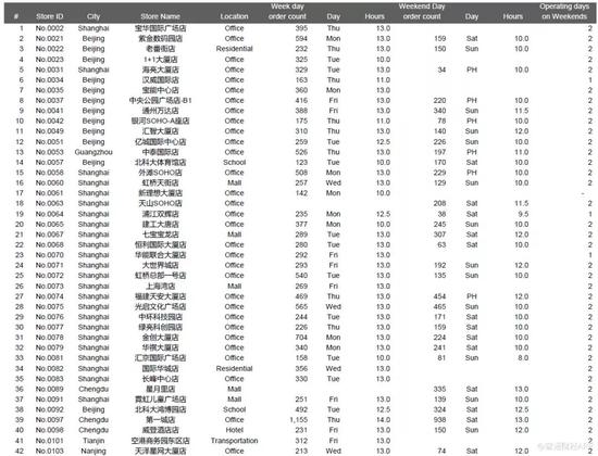 下面是一些城市的位置类型和店龄等对比数据,其中主要信息有:1、瑞幸整体直营门店组合(截至2019年12月31日,我们在瑞幸APP上共找到4409家门店);2、我们成功执行并在数据分析中呈现的981个门店日;3、我们访问了851家店,但是没有记录下一整天的视频,原因包括执行失败——被瑞幸员工赶出来,设备崩溃等等,或者质量控制失败,主要是由于超过10分钟的连续镜头丢失了一整天。执行失败的门店日的数据没有用在数据分析中。