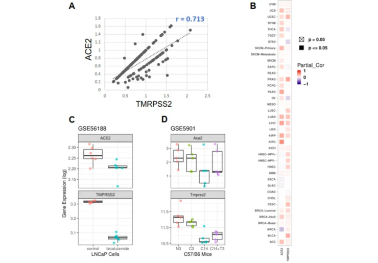2、雄激素受体可以直接正向调控ACE2的表达。分析发现,雄激素受体(AR)与 ACE2 呈共表达模式;进一步分析发现,雄激素受体与 ACE2 和 TMPRSS2 的表达呈正相关这一现象,普遍存在于人体的多个组织器官中,而雄激素被剥夺之后,ACE2 和 TMPRSS2 的表达也随之下调;另外,进一步提示雄激素受体可能与 ACE2 上游的增强子区域结合而促进 ACE2 的表达。