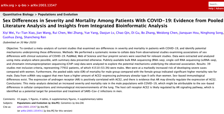 3 月 30 日,在论文预印本网站 ArXiv 上,出现了一篇标题为 Sex Differences in Severity and Mortality Among Patients With COVID-19: Evidence from PoOLEDLiterature Analysis and Insights from Integrated Bioinformatic Analysism 的研究论文。