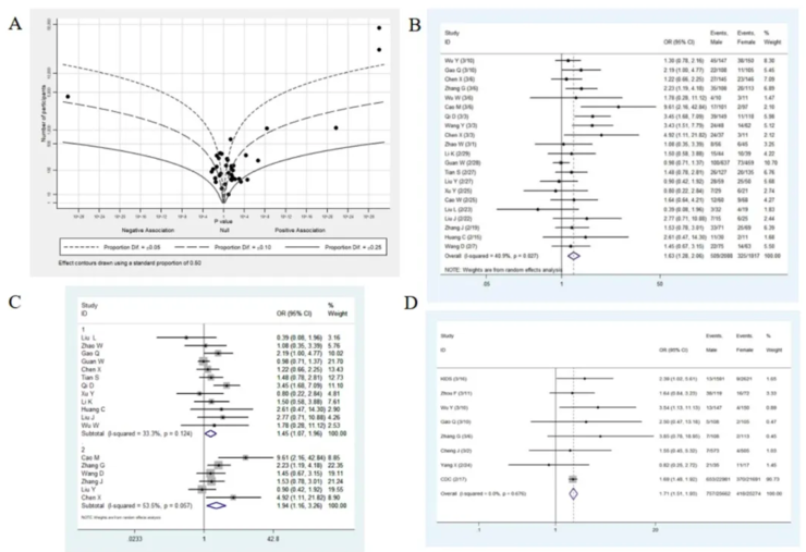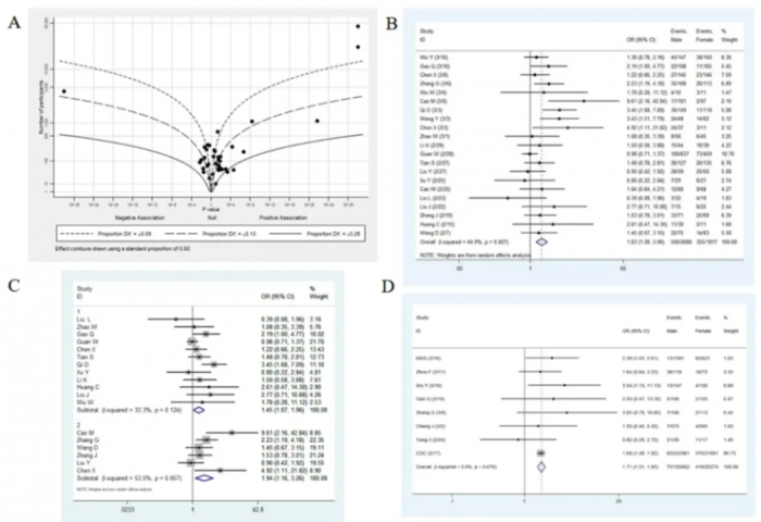 结果显示,在所有病例的 39 项总体研究中,新冠病毒的男性发病率要显著高于女性(OR = 1.12),其中来自中国人群的 34 项研究更是支持这一结论(OR=1.13)。