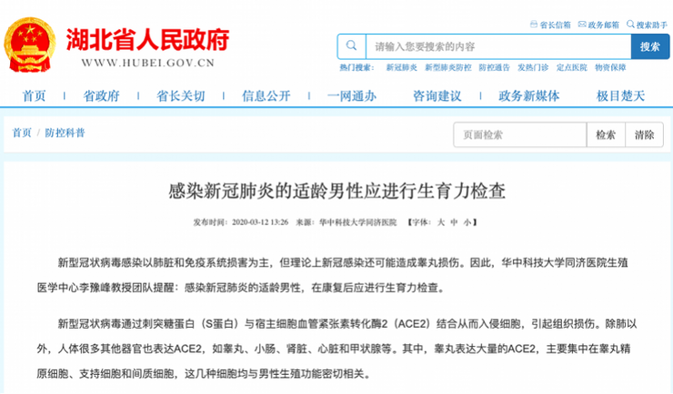 之前 3 月 12 日,湖北省人民政府网站刊文《感染新冠肺炎的适龄男性应进行生育力检查》,正是基于相同的原因。