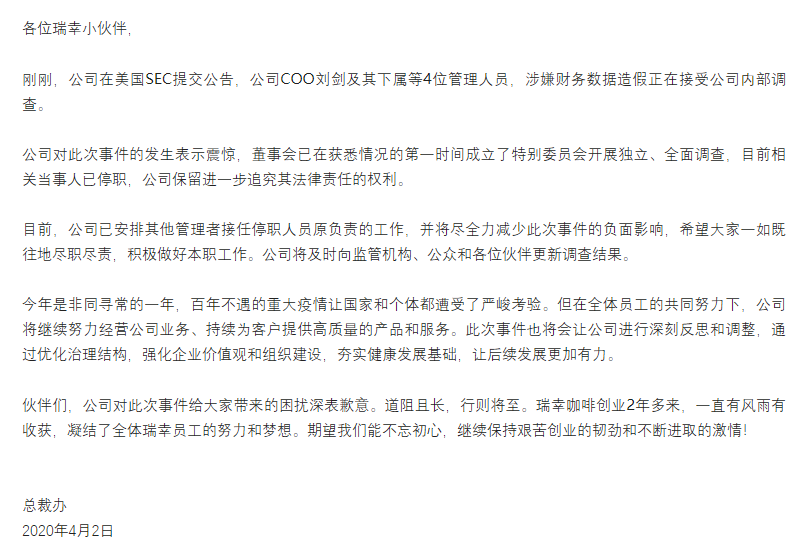 根据其公告,瑞幸咖啡的独立特别委员会调查发现,从2019年第二季度开始,公司首席运营官兼董事刘剑和向他汇报的几名员工“存在某些不当行为,包括捏造某些交易,数额达22亿元人民币”。瑞幸咖啡已经暂停刘剑和与相关雇员的职务,暂停和终止相关各方的合同和交易。