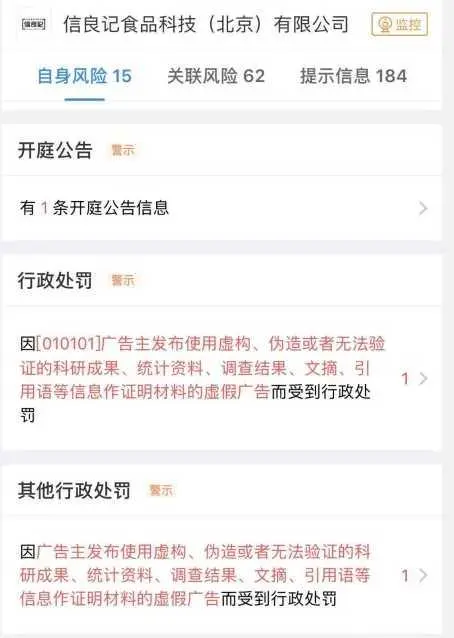经天眼查风险数据,2019年10月,信良记(小龙虾)因广告主发布使用虚构、伪造或者无法验证的科研成果、统计资料、调查结果、文摘、引用语等信息作证明材料的虚假广告,被北京市密云区市场监督管理局罚款900元。