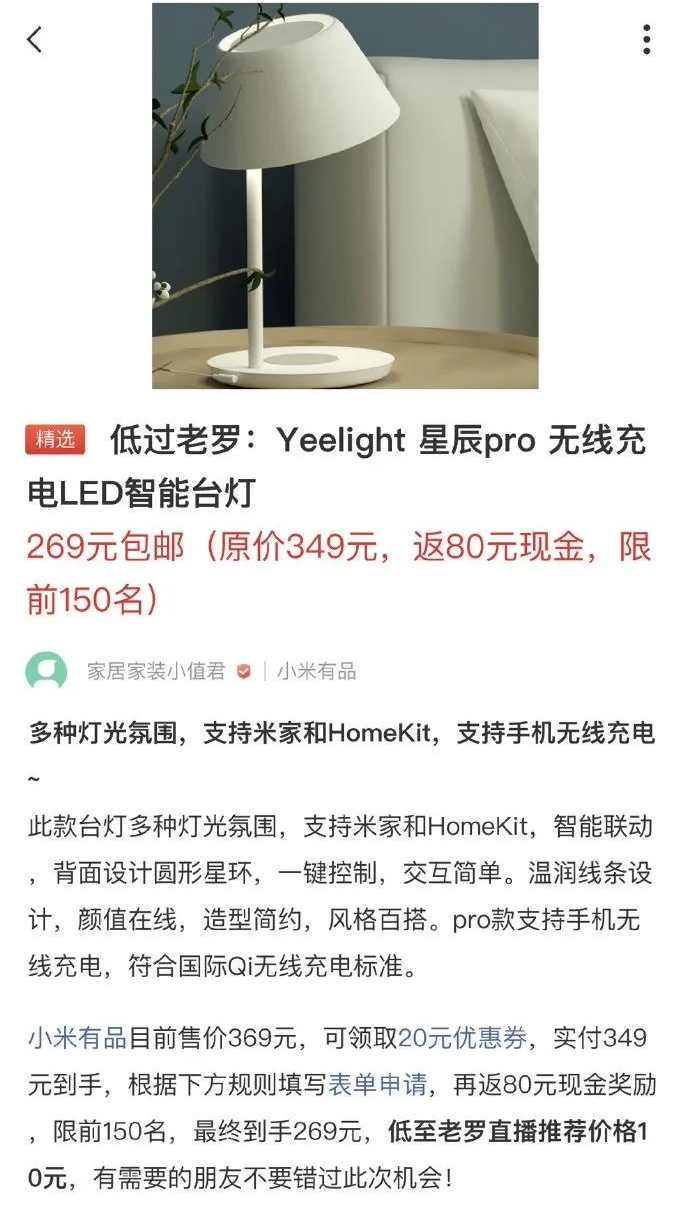 不过也有网友发现这些渠道的降价猫腻,比如这款Yeelight床头灯,价格是低,但限150个名额,而且是填表格后返80元的优惠形式,基本和骗点击没差了吧……