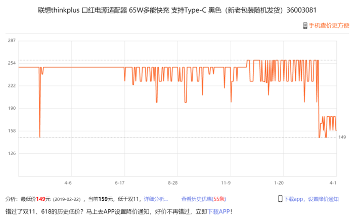 当看到联想Thinkplus口红电源适配器65W版本只要99元,求真君第一件事就是查了京东自营历史低价:149元,心想老罗这回价格很有诚意啊……