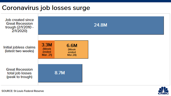这意味着在3月的最后两周里,约有1000万美国人申请失业救济,这几乎是2010年2月至2020年2月美国经济增加的2480万就业人数的一半。