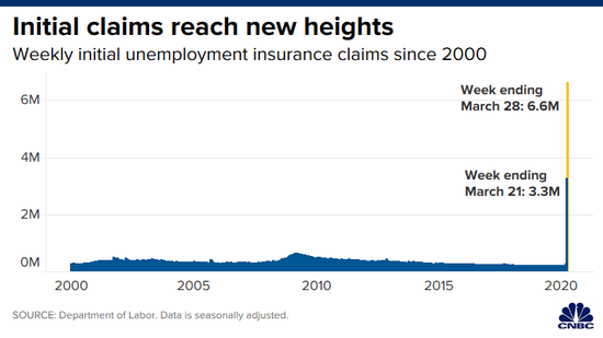 美国劳工部周四公布的初请失业金人数显示,上周有660万美国人申请失业救济金,创历史新高。而在截至3月21日的一周中,有330万人申请失业。