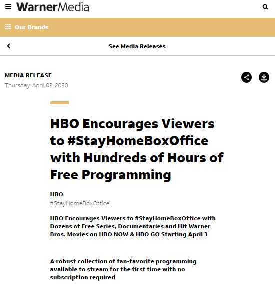 近日,据外媒报道,为了给人们更多留在家里的理由,HBO(《黑道家族》、《色欲都市》、《权力的游戏》)宣布免费一批长达500小时的精品电视剧、纪录片、电影,用户无需订阅即可使用HBO客户端进行观看。
