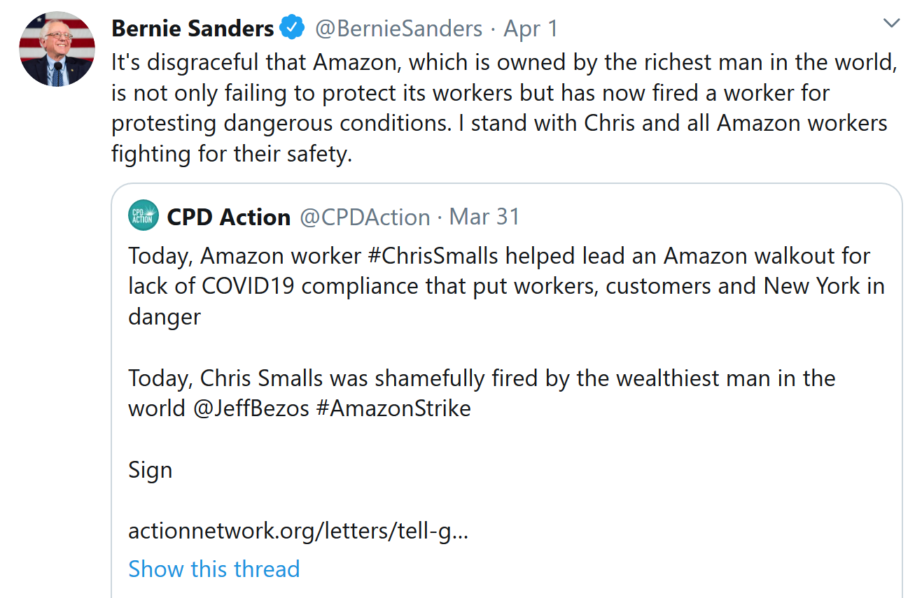 此前,斯莫尔斯表示自己因为组织了罢工而遭到解雇,但是亚马逊表示,该公司解雇这名员工的原因是,他违反了公司的社交距离规定,此前亚马逊因为他曾与另一名确诊了新冠病毒的员工有过近距离接触而要求他进行自我隔离,但是他并未遵守公司的命令。