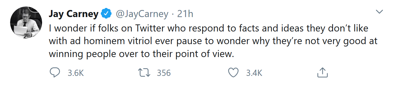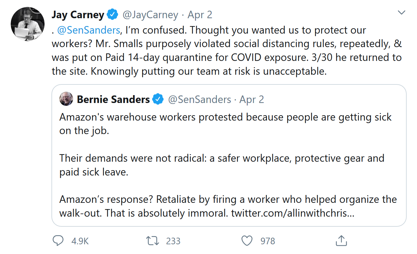 曾在巴拉克·奥巴马(Barack Obama)执政时期担任总统新闻秘书的卡尼在一条推文中表示,罢工只发生在少数的地方,在亚马逊数十万员工中,只代表几百人。他表示,虽然亚马逊尊重工人的话语权以及在抗议方面所做出的努力,但是“这些权利不能给不良行为提供豁免”。他所指的不良行为,是斯莫尔斯在隔离期间前往史丹顿岛工作地点的行为。