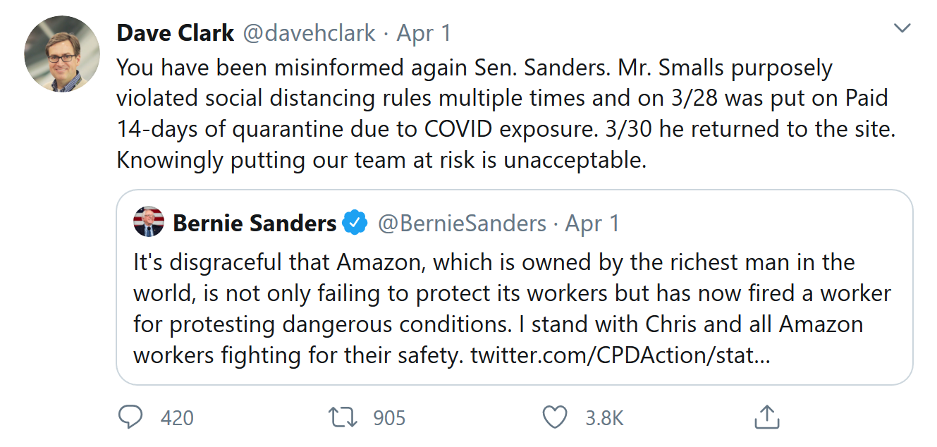 亚马逊发言人杰·卡尼(Jay Carney)和亚马逊零售业务负责人戴夫·克拉克(Dave Clark)本周曾多次在Twitter上对斯莫尔斯遭到解雇,以及史丹顿岛工人罢工一事表达了异议。克拉克在周一发布的一条推文中表示:“今天的‘罢工’被戏剧性地夸大了。史丹顿岛仓库有5000多名工人,而参加罢工的只有15人(不到0.5%)。”
