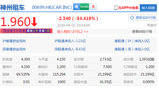 4月3日上午消息,神州租车现暴跌54.42%,报1.96港元,最低价为1.2港元,最高价4.19港元,创上市新低。截至发稿,神州优车跌14.34%,报10.99元。4月2日晚,瑞幸被曝伪造交易22亿股价暴跌,之后,瑞幸咖啡向SEC发布公告,承认虚假交易22亿元。