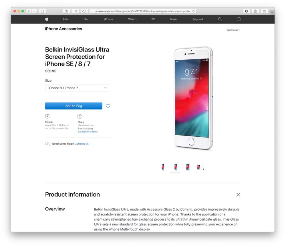 这款配件称之为“InvisiGlass Ultra Screen Protection for iPhone SE/8/7”,目前已经在苹果美国官网上线,零售价格为39.95美元。小编查询了下苹果中国官网,目前并没有这款产品。