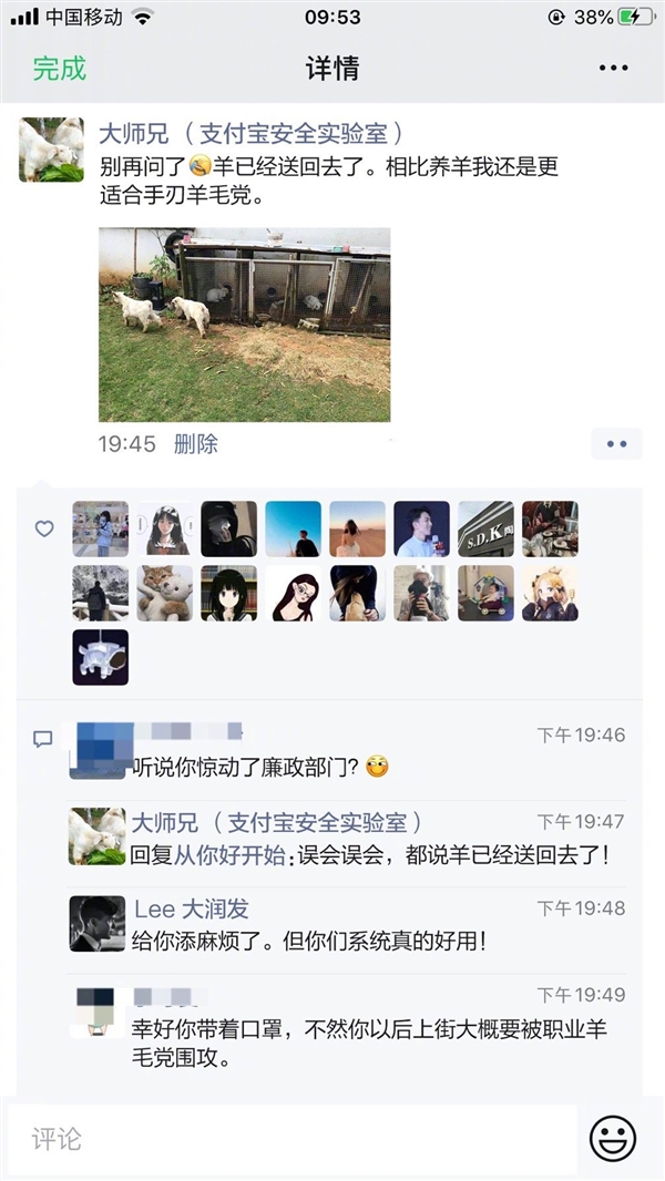 据了解,这名程序员就职于支付宝安全实验室,被同事称为“大师兄”。他在朋友圈表示,羊已经送回去了。