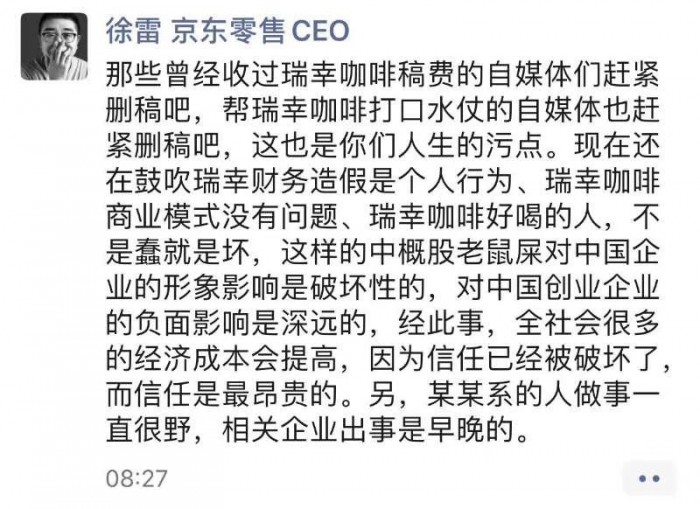 4月3日消息,据知情人士透露,今日早间,京东零售CEO徐雷对瑞幸财务造假行为在朋友圈进行了评价,他称,现在鼓吹瑞幸的商业模式非蠢即坏,并且他认为“某某系的人做事一直很野,相关企业出事是早晚的”。