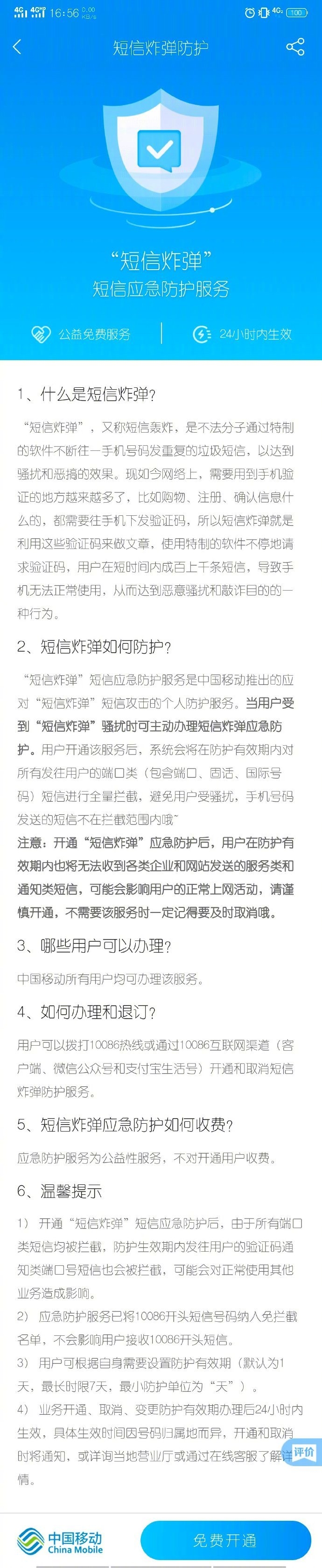 官方称,“短信炸弹”短信应急防护服务是中国移动推出的应对“短信炸弹”短信攻击的个人防护服务。当用户受到“短信炸弹”骚扰时可主动办理短信炸弹应急防护。中国移动所有用户均可办理,用户可根据自身需要设置防护有效期(默认为1天,最长时限7天,最小防护单位为“天” )。