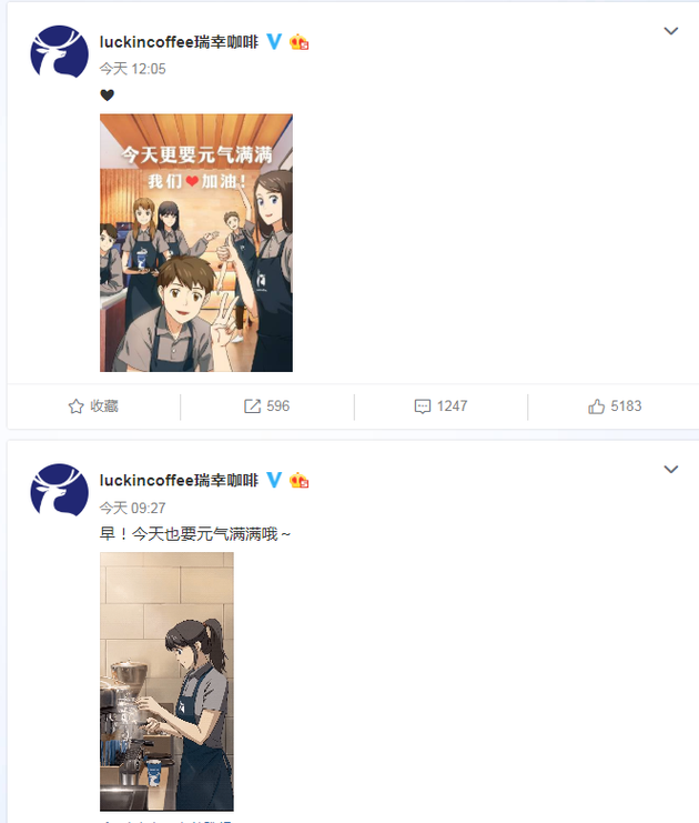 不仅是陆正耀,瑞幸咖啡官微今天也两度发图鼓励: