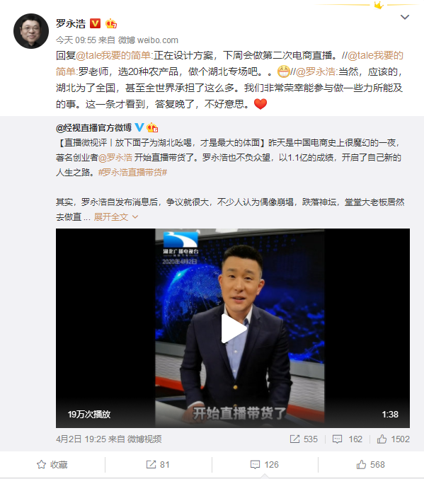 有网友提议选20种农产品,做个湖北专场。罗永浩表示“正在设计方案,下周会做第二次电商直播。”