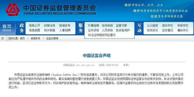 中国证监会:中国证监会高度关注瑞幸咖啡财务造假事件,对该公司财务造假行为表示强烈的谴责。不管在何地上市,上市公司都应当严格遵守相关市场的法律和规则,真实准确完整地履行信息披露义务。