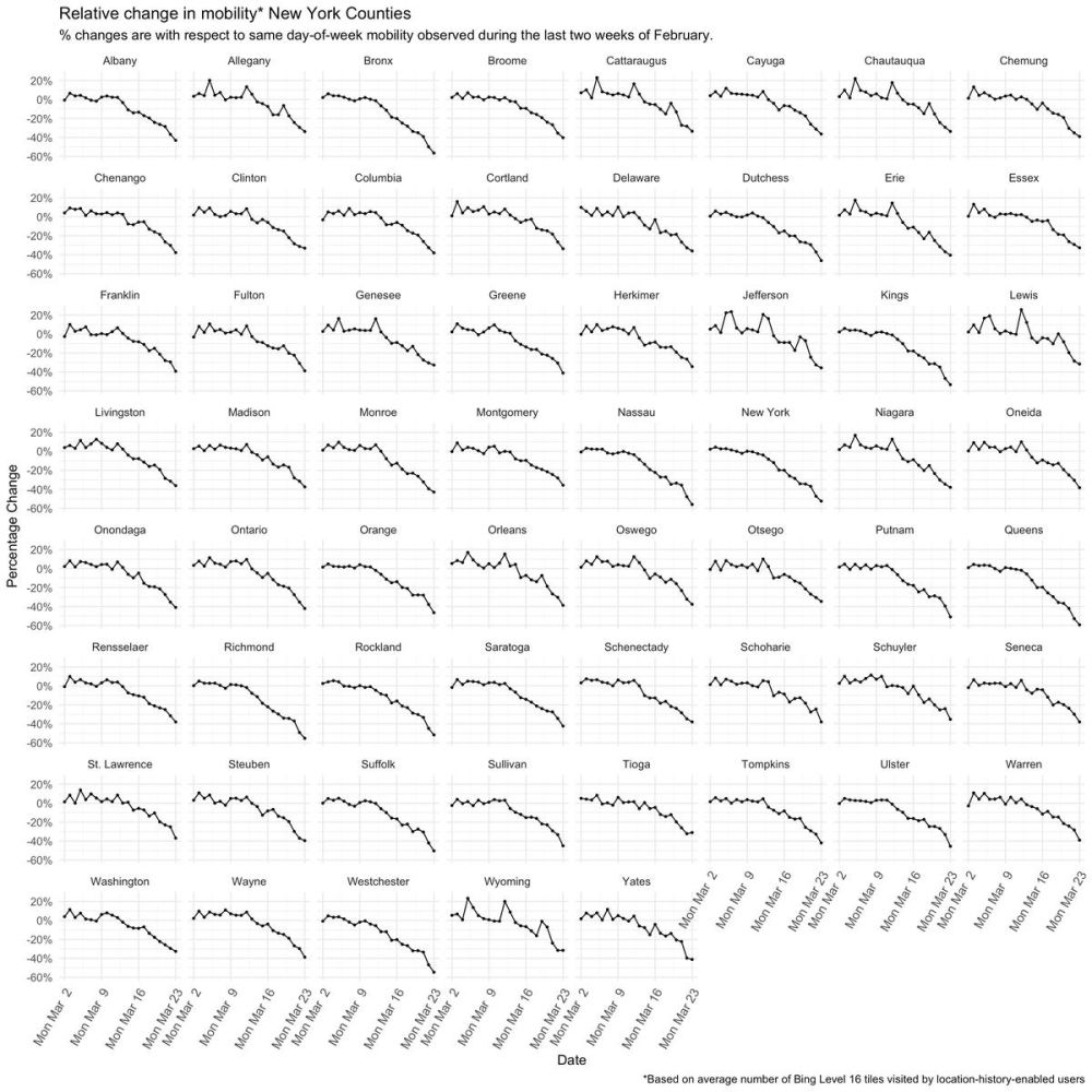 利用Facebook提供的移动位置数据,传染病研究人员向美国各个城市和州提供每日疫情动态,评估社会社交疏导令在减缓新冠病毒传播方面的效果。根据纽约市卫生官员分享的最新图片,显示今年3月份美国各城居民听从限制非必要外出活动指导之后的流动性情况。