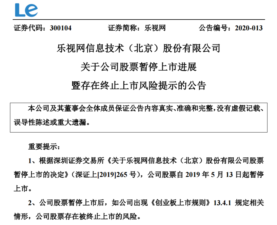 4月3日消息,日前,乐视网发布《关于公司股票暂停上市进展暨存在终止上市风险提示的公告》(以下简称为“公告”)。公告显示,乐视网2019年未经会计师事务所审计的归属于上市公司股东的净利润约为-112.82亿元,归属于上市公司股东的所有者权益约为-143.29亿元。